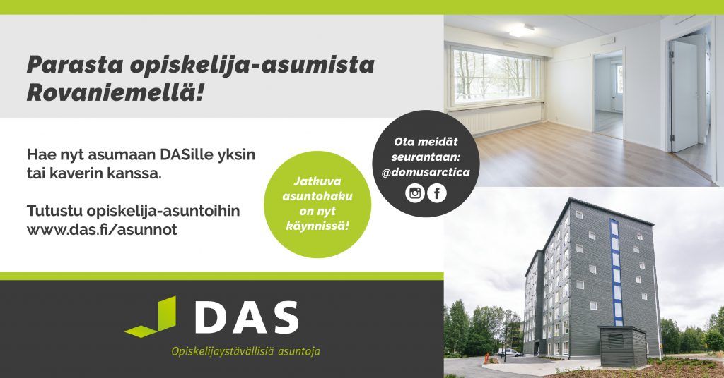 When moving to a new town, the first and certainly most important thing is to find a new apartment for yourself. Fortunately, there is the Domus Arctica Foundation, or DAS, in Rovaniemi, which offers students affordable homes in excellent locations. You can apply for housing from DAS if you study in Rovaniemi, in a post-primary school, such as the University of Lapland.