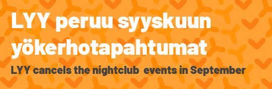 LYYn hallitus on päättänyt sähköpostikokouksessaan 29.8.2020 perua syyskuun yökerhotapahtumat koronaviruksen vuoksi. Peruminen koskee Fuksiaisten jatkoja sekä Varjoavajaisia, jotka oli määrä järjestää syyskuun alussa. Peruminen ei koske Fuksiaisten rastikierrosta, joka toteutetaan ulkotiloissa ja viranomaisohjeistuksen mukaisesti.