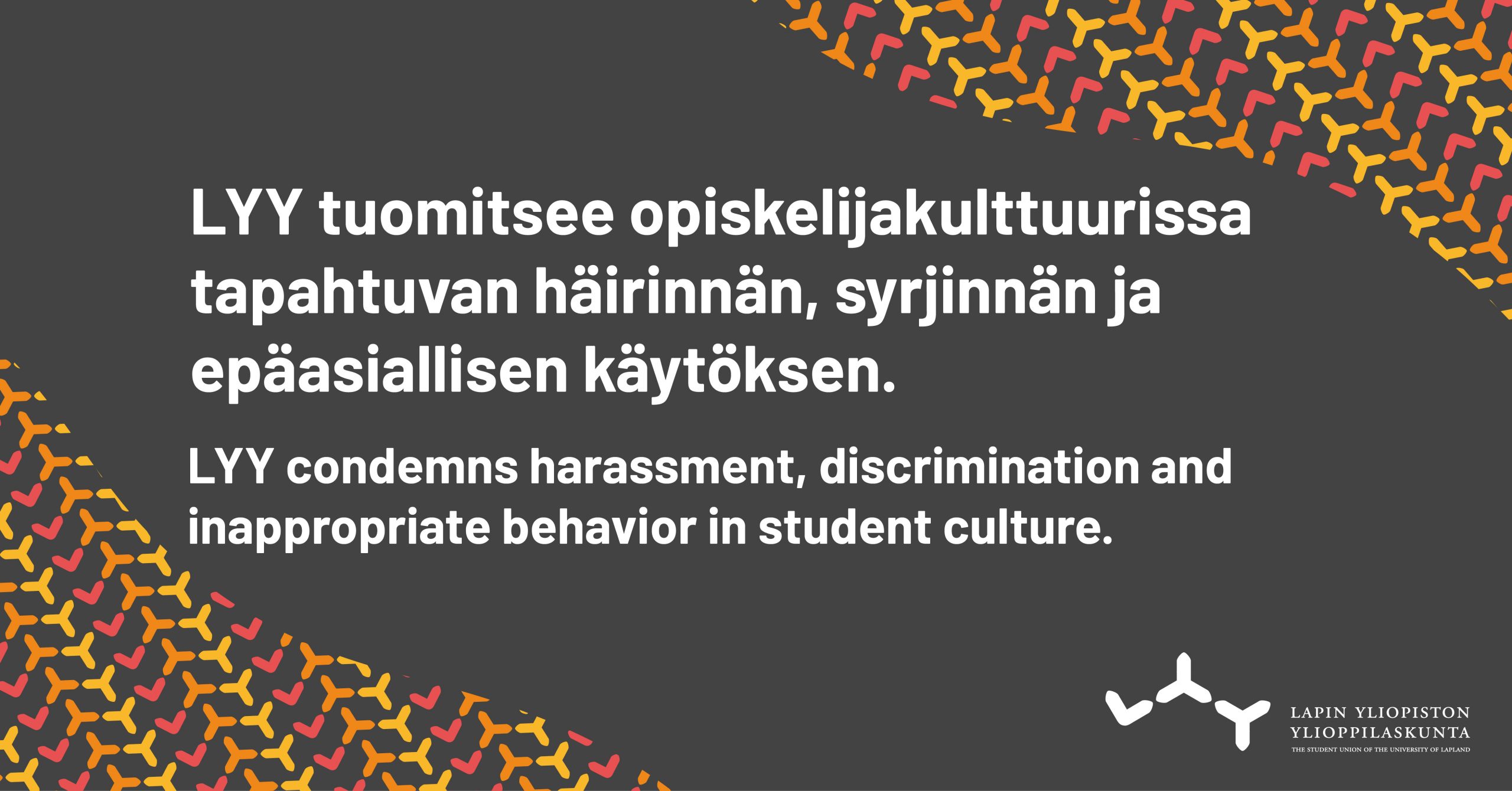 Ongelmien ratkaiseminen alkaa niiden tiedostamisesta ja oman toiminnan kriittisestä tarkastelusta. Tasa-arvon ja yhdenvertaisuuden edistäminen on jatkuvaa ja pitkäjänteistä työtä. Seksuaaliseen suuntautumiseen, sukupuoleen tai sukupuoli-identiteettiin liittyvää häirintää tai syrjintää ei hyväksytä ylioppilaskunnan toiminnassa tai tapahtumissa. Lapin yliopiston ylioppilaskunta tiedostaa opiskelijakulttuuriin juurtuneen sukupuolijaottelun, heteronormatiivisuuden sekä epäasialliset perinteet ja aikoo tehdä aktiivista työtä näiden ongelmien ratkomiseksi yliopistoyhteisössään. LYY puuttuu epätasa-arvokohtiin ja edesauttaa niiden korjaamista. Lapin yliopiston ylioppilaskunnan arvoihin kuuluvat yhdenvertaisuus ja tasa-arvo, jotka luovat perustan kaikelle toiminnalle. Toimintaa ohjaa esimerkiksi LYYn tasa-arvo- ja yhdenvertaisuussuunnitelma.