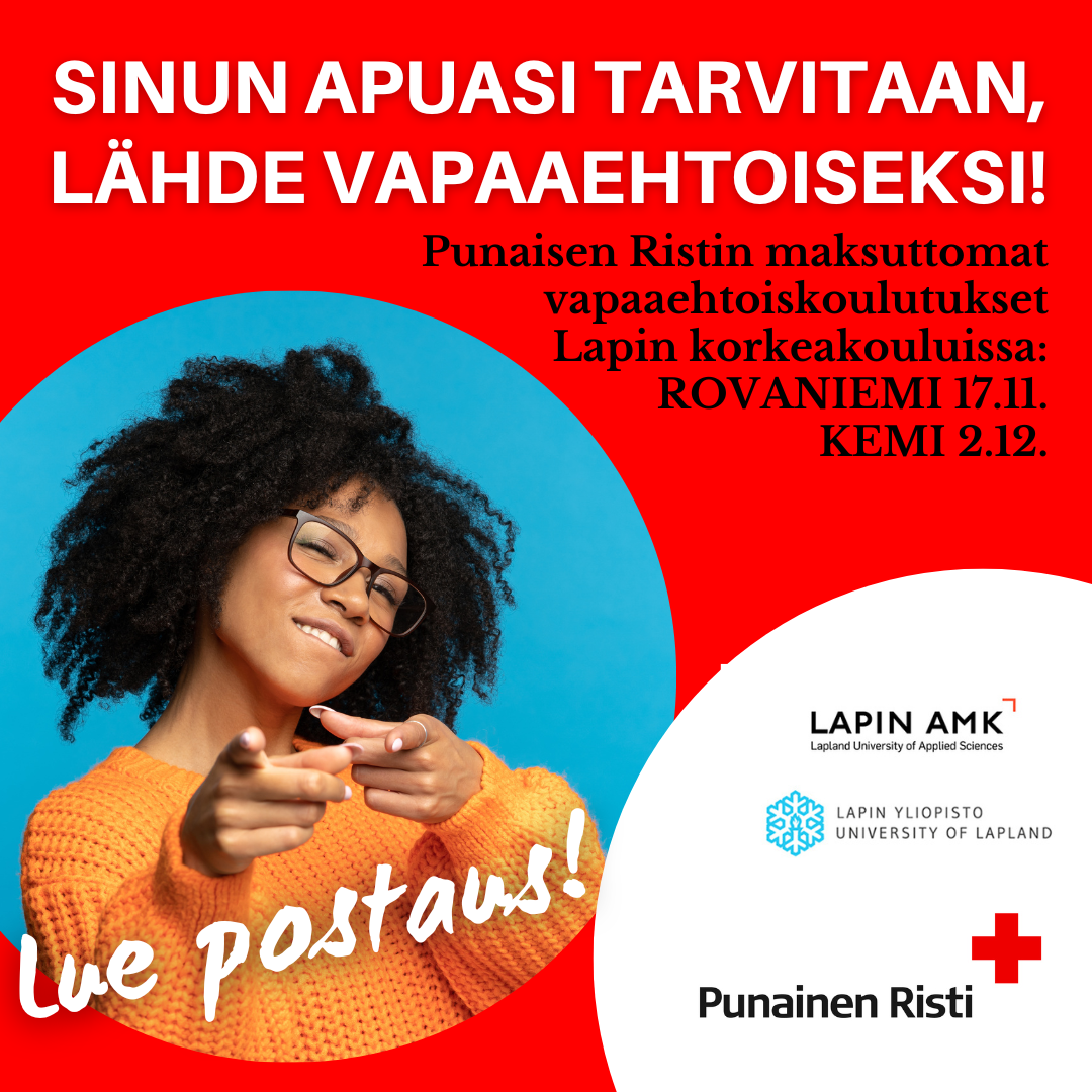 Punainen Risti ja Lapin korkeakoulut järjestävät yhteistyössä vapaaehtoistoiminnan koulutuksia lähiviikkoina. Kukin koulutus kestää kolme tuntia, ne ovat maksuttomia ja niistä saa osallistumistodistuksen. Koulutuksen jälkeen voi lähteä mukaan Punaisen Ristin vapaaehtoistoimintaan.